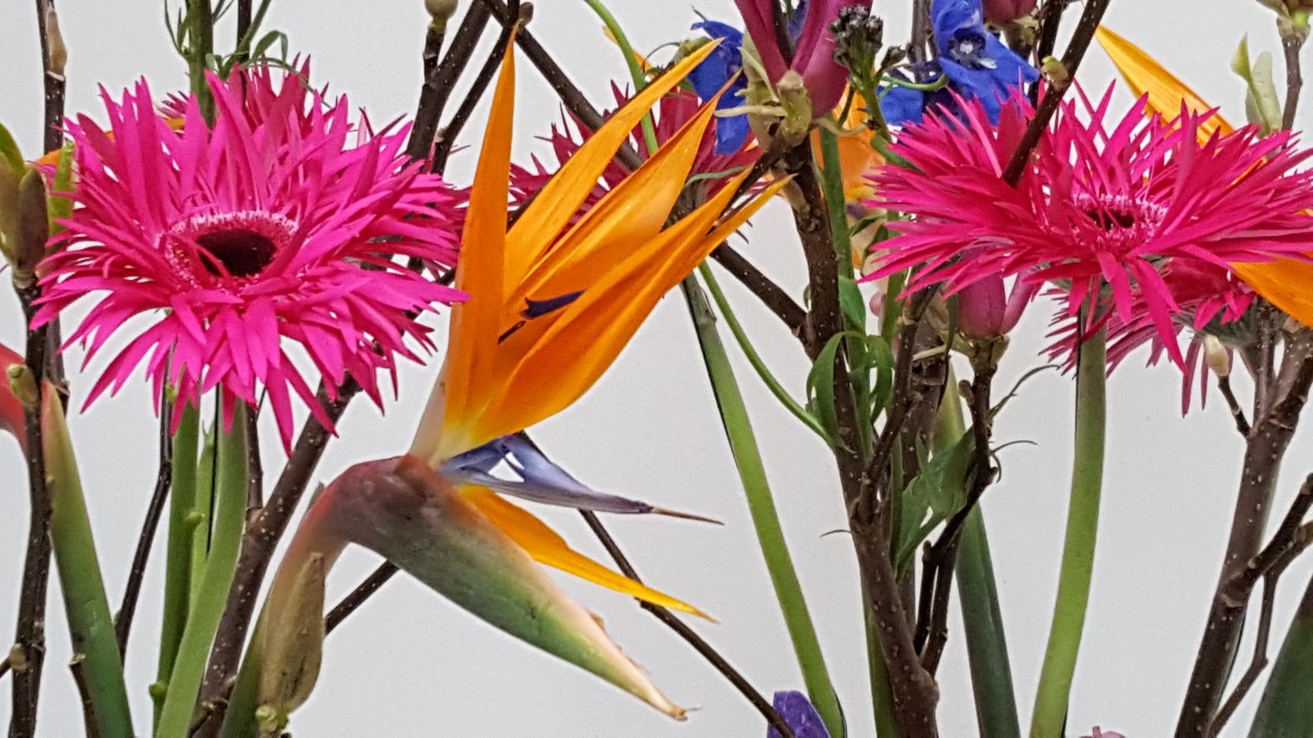 Roze, donkerroze boeket, met anjers, chrysanten rozen en andere soorten bloemen in roze kleuren