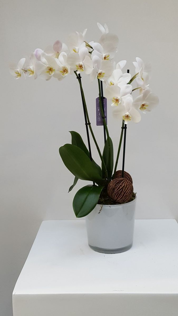 Deze mooie witte Phalaenopsis in een witte pot , is stijlvol, mooi in elk interieur.