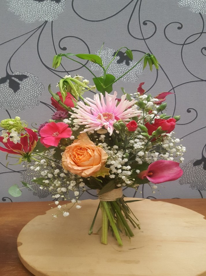Vrolijk kleurig veld boeket met roze, oranje en zalmkleurig bloemen