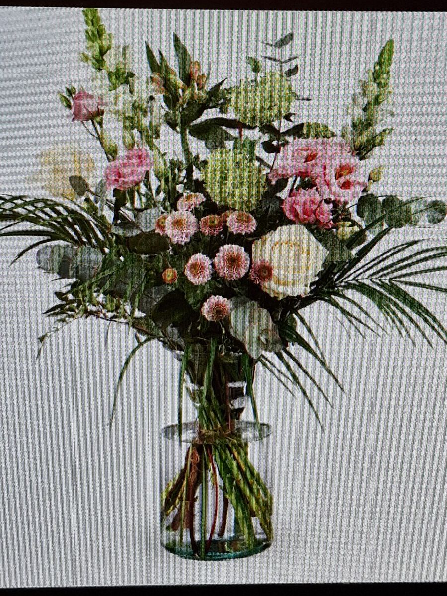 Boeket Lola, met witte Leeuwenbek, 1 tak Sneeuwbal, roze Santini chr , witte rozen , roze Eustoma, met palmblad gedecoreerd